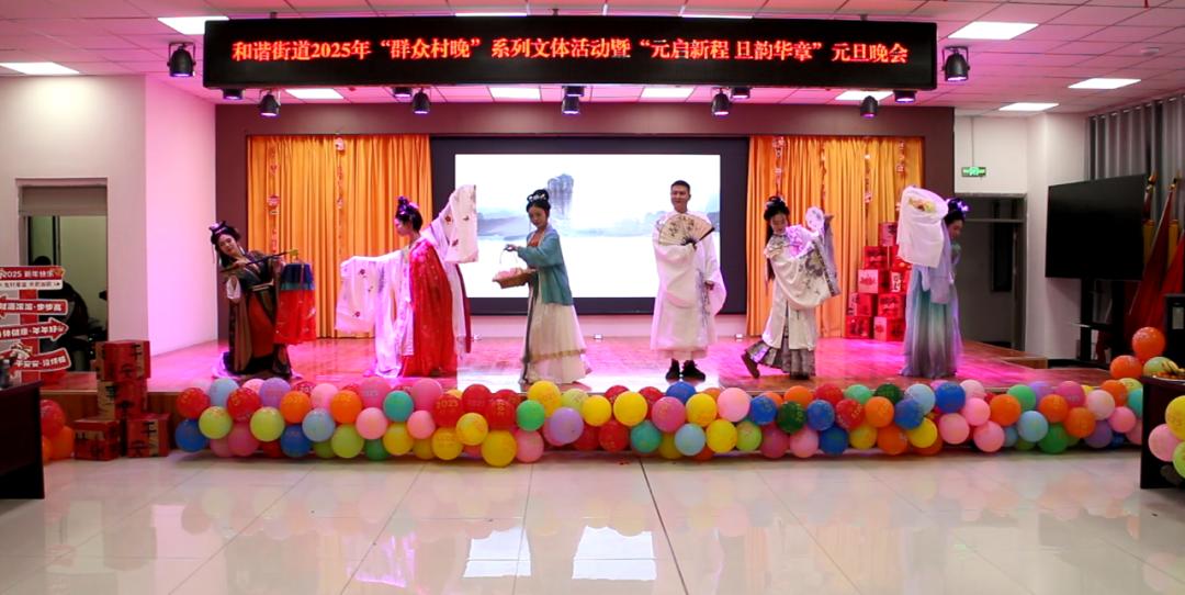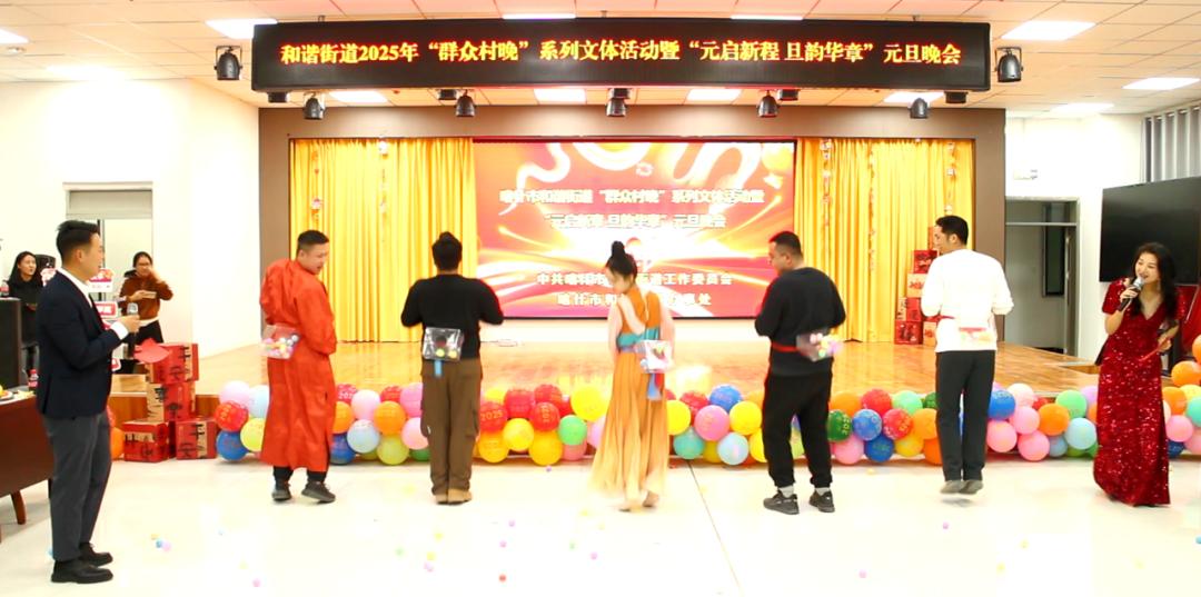 和谐街道12月30日,和谐街道举办“群众村晚”系列文体活动之“元启新程 旦韵华章”元旦晚会。现场热闹非凡,群众自编自演的舞蹈、歌曲、汉服秀、古筝、小提琴等节目精彩纷呈,赢得了观众的阵阵掌声和欢呼声。趣味游戏互动环节,大家跃跃欲试,积极参与。(和谐街道 供稿)