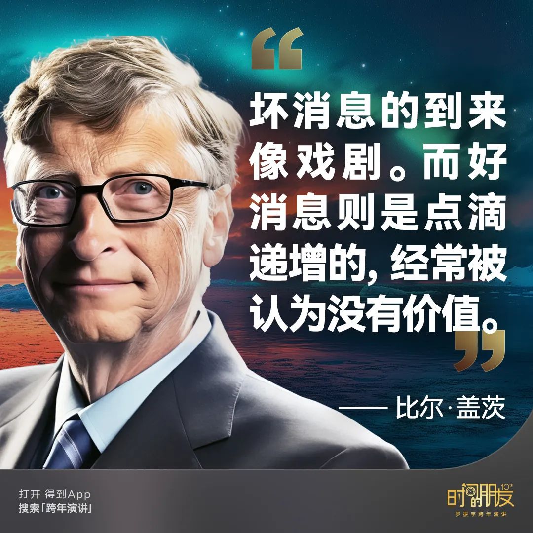 我特别喜欢比尔·盖茨的一个说法,他说:“做一个乐观主义者并非意味着忽略悲剧和不公。它意味着你热情地寻找那些在各个领域做出进步的人,并帮助扩大那些进步。”
