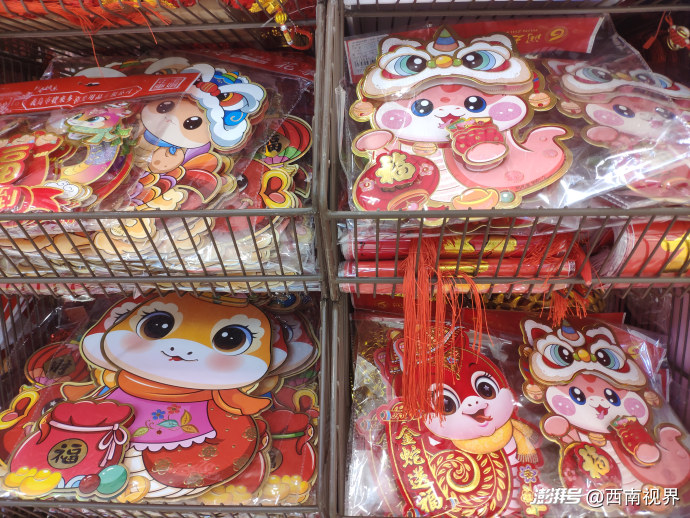 一些含有“蛇”元素的商品纷纷占据了市场“C位”,有灵蛇献瑞、金蛇报春、蛇行天下、蛇年吉祥等寓意美好的毛绒玩具、新春饰品、挂件琳琅满目,深受市民的喜爱。其中,福字、对联、灯笼、挂件等饰品最为畅销。
