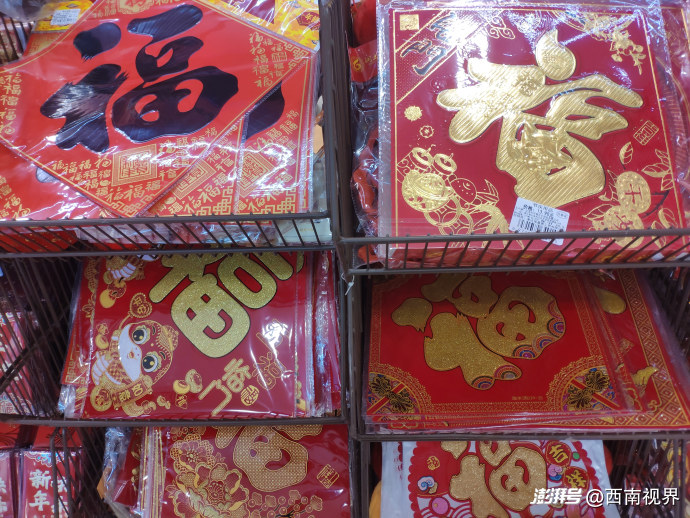 走进位于重庆市九龙坡区杨家坪步行街的一家大型超市,红红火火的气氛扑面而来,各式各样的对联、“福”字、红彤彤的灯笼和贴画让人眼花缭乱,消费者们纷纷选购心仪的饰品为家中增添喜气。