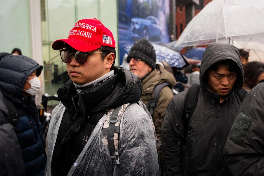 首尔示威活动中,一名男子头戴“让美国更伟大”帽子 《华盛顿邮报》专栏作家洪成国(Hong Sung-guk,音译),将“中国干涉论”这一指控称之为另一种阴谋论,并将其比作指控2024年韩国国会选举被反对派操纵的说法。