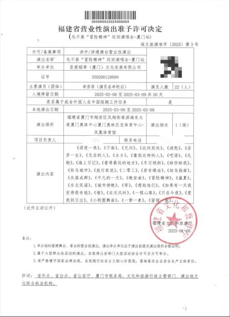 原标题:《审批通过!毛不易3月8号厦门翔安开唱!》