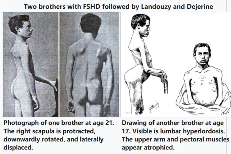 FSHD命名者Landouzy和Dejerine记录的患者临床表现目前的医学研究认为FSHD的发病机制与4号染色体的基因表达异常有关,且该疾病会遗传后代,部分研究认为男性相较于女性更容易发病,病情也更加严重。阿伟的家族便有FSHD遗传史,他身为教师的外公在四十多岁时已经难以举起粉笔在黑板上板书。从阿伟记事起,外公便手不离拐杖,而他的舅舅在十多岁时也已经干不了重体力活。
