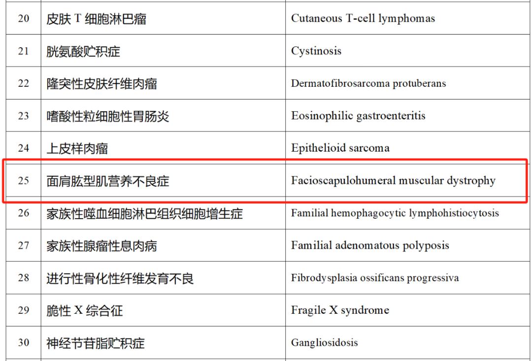 FSHD在《第二批罕见病目录》中位于第25位与此同时,“罕见病”也迎来了统一的学术定义。在中国罕见病/孤儿药定义第三次多学科专家研讨会发布的《中国罕见病定义研究报告2021》中,罕见病被定义为“新生儿发病率小于万分之一、患病率小于万分之一、患病人数小于14万的疾病”。报告执笔人之一王琳指出:“随着医学的进步和人们对罕见病认知程度的不断提高,原来的中国罕见病定义需要修订,仅用罕见病目录方式推动罕见病防治与保障工作,已经不能满足罕见病医学发展和政策制定等需求,中国罕见病事业需要在规范化、制度化、法治化基础上推进。”