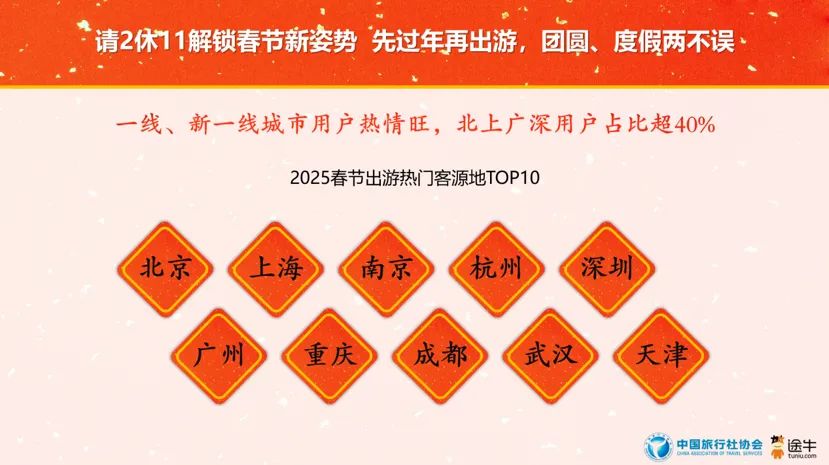 日前,中国旅行社协会联合途牛旅游网发布的《2025春节旅游消费趋势报告》(以下简称《报告》)显示,这个春节假期,传统文化游热度空前高涨,南京位列境内游热门目的地“TOP10”。
