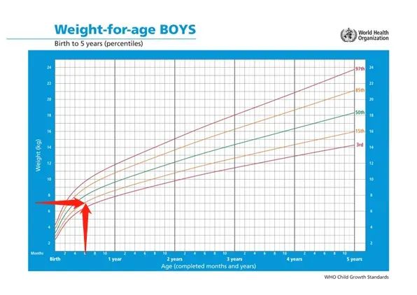 很多时候宝宝被认为体重增长不达标,常常是由于没有选对标准。注意生长曲线版本,选择WHO2006年版本,同时注意区分男孩曲线图(蓝色)和女孩曲线图(红色)。