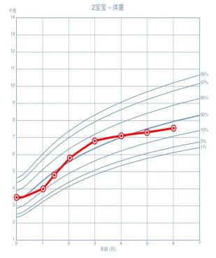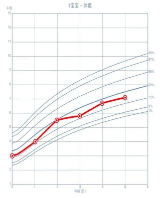 假设宝宝出生时体重3.2公斤,随后的几个月里,他的体重逐渐增长,在生长曲线上的15%-50%之间波动,这表示宝宝体重处于正常范围内,正在健康地成长。