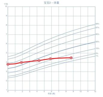 图上横坐标代表宝宝的月龄,纵坐标代表宝宝的体重,各条曲线后的的数值代表的是不同的百分数位置。定期检测宝宝的身高体重,再绘制出不同的点,点连成线就是宝宝的生长曲线了。02