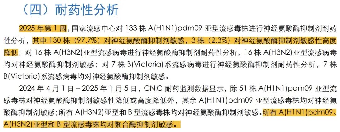 1、自24年4月1日算起,24年第24周之前,所有A(H1N1)pdm09亚型流感毒株对神经氨酸酶抑制剂(如奥司他韦)均敏感。