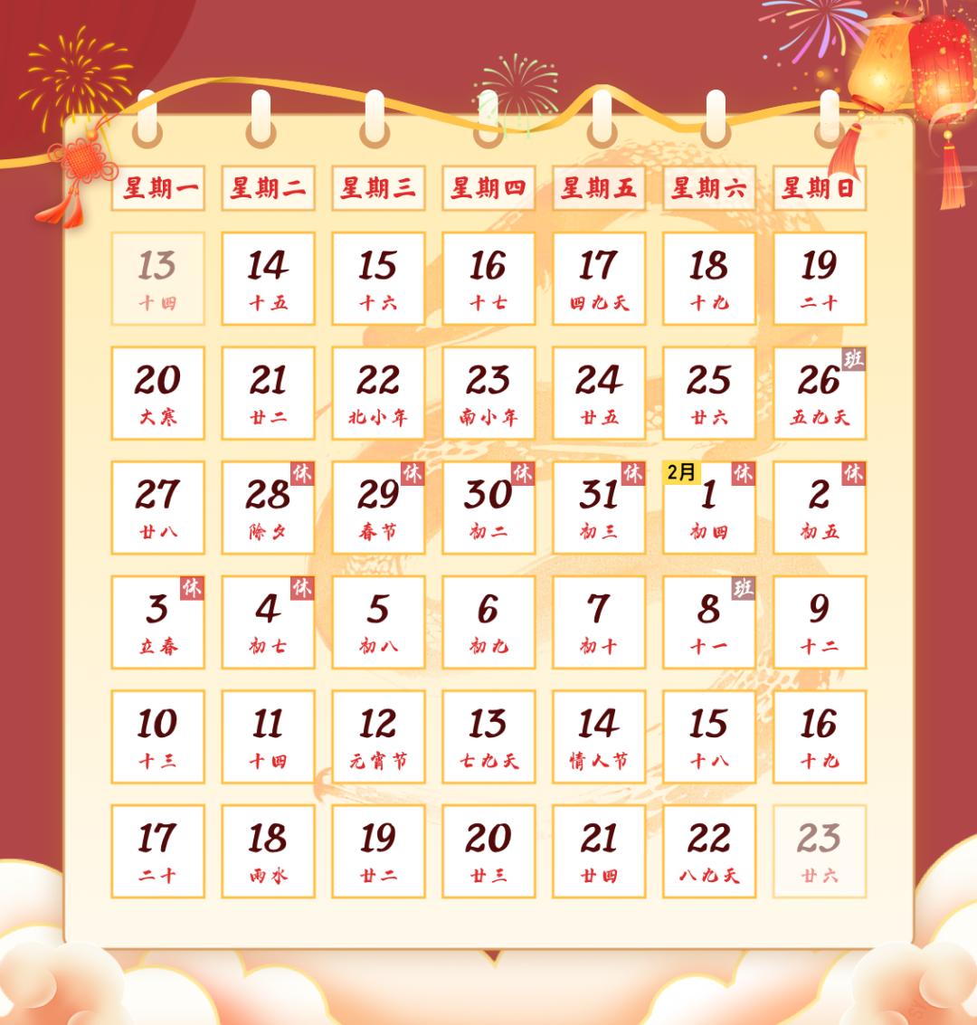 春节假期:1月28日(除夕)至2月4日(初七),共8天;