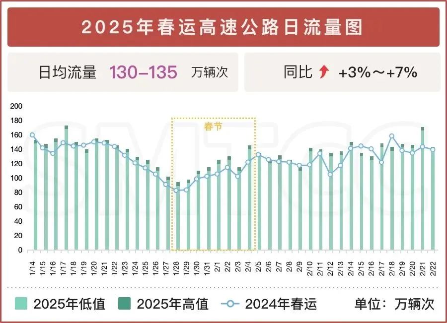 2025年春运期间出行需求将持续增长,2025年春运期间,高速公路预计日均流量130-135万辆次。春运前期,高速公路车流规模居各阶段首位,节后路网车流规模持续回升,正月十五之后高速公路流量基本恢复到常态水平。