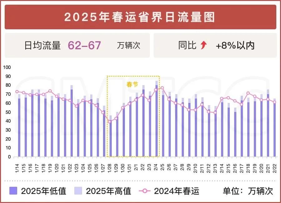 2025年春运从1月14日开始至2月22日,共40天,其中春节小客车免费通行共计8天,免费时间从1月28日(除夕)0时至2月4日(初七)24时。春运期间高速公路、省界道口、快速路等路况预估及出行指南详见↓