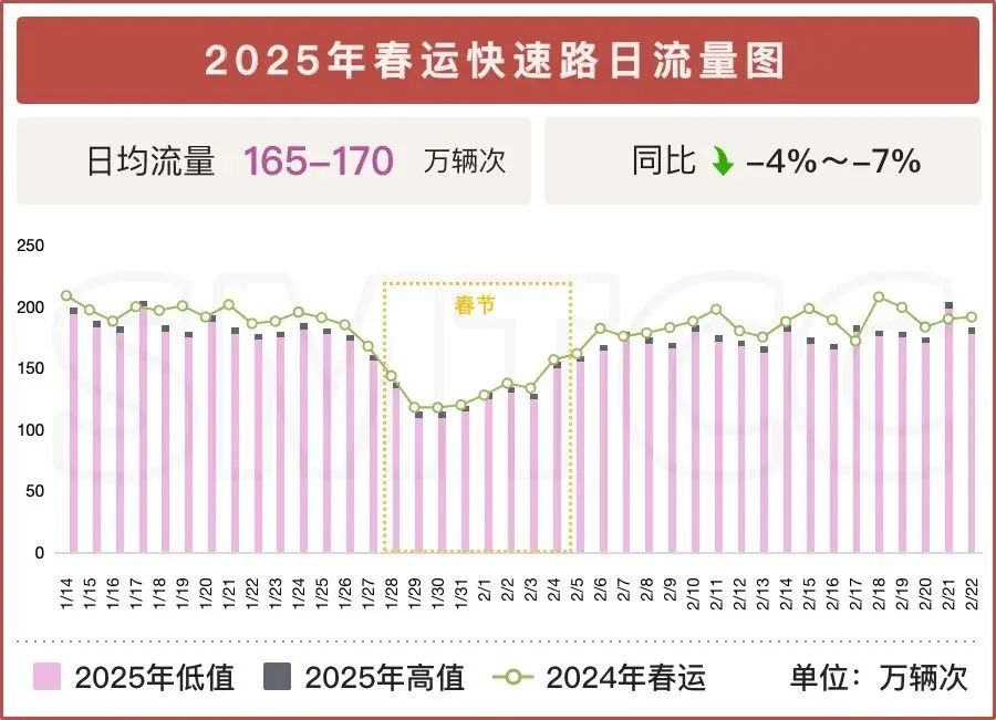 2025年春运期间,快速路预计日均流量165-170万辆次。返乡车流集中出行的高峰日,与高速公路衔接的快速路将出现时段性、方向性拥堵。