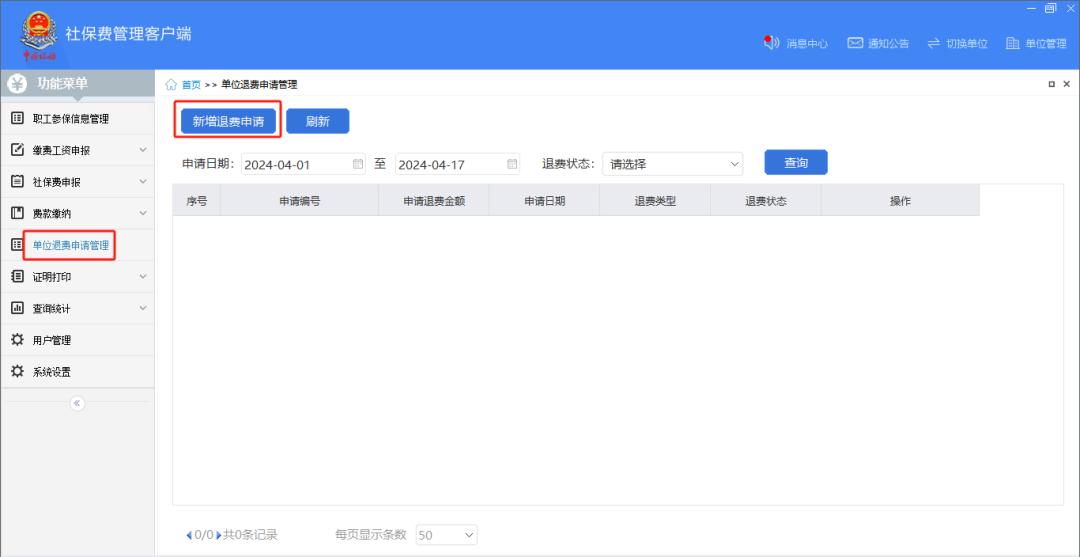 用人单位登录社保费管理客户端(用人单位),在【单位退费申请管理】模块点击【新增退费申请】按钮。