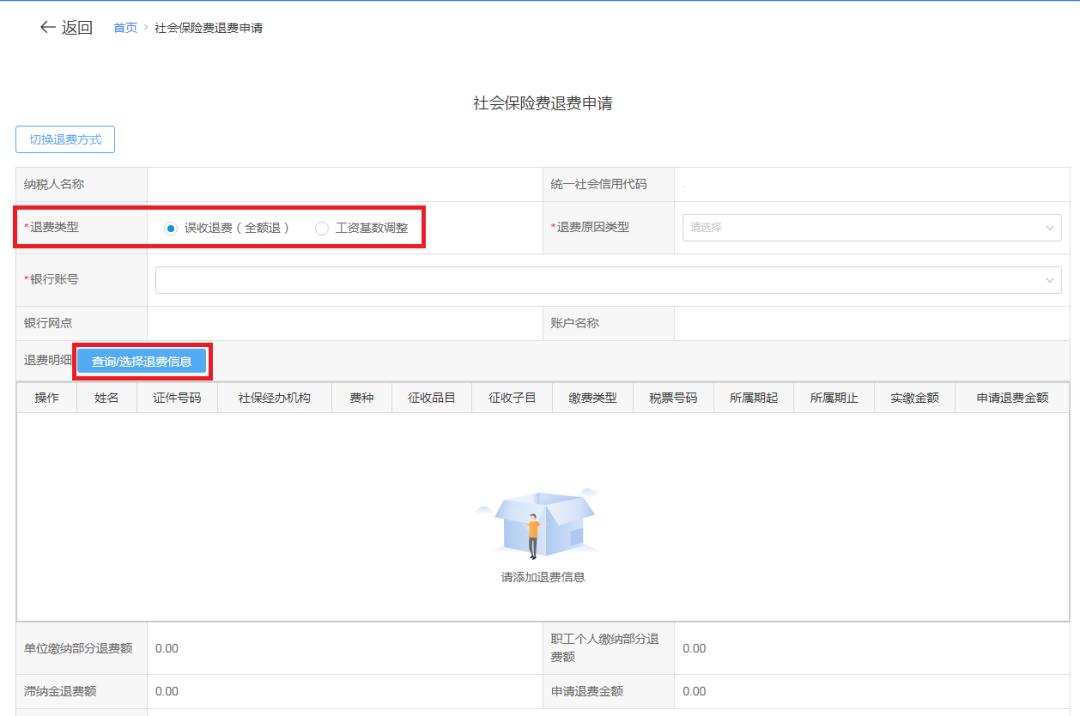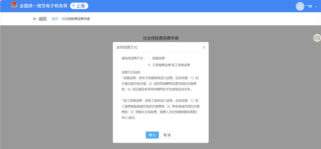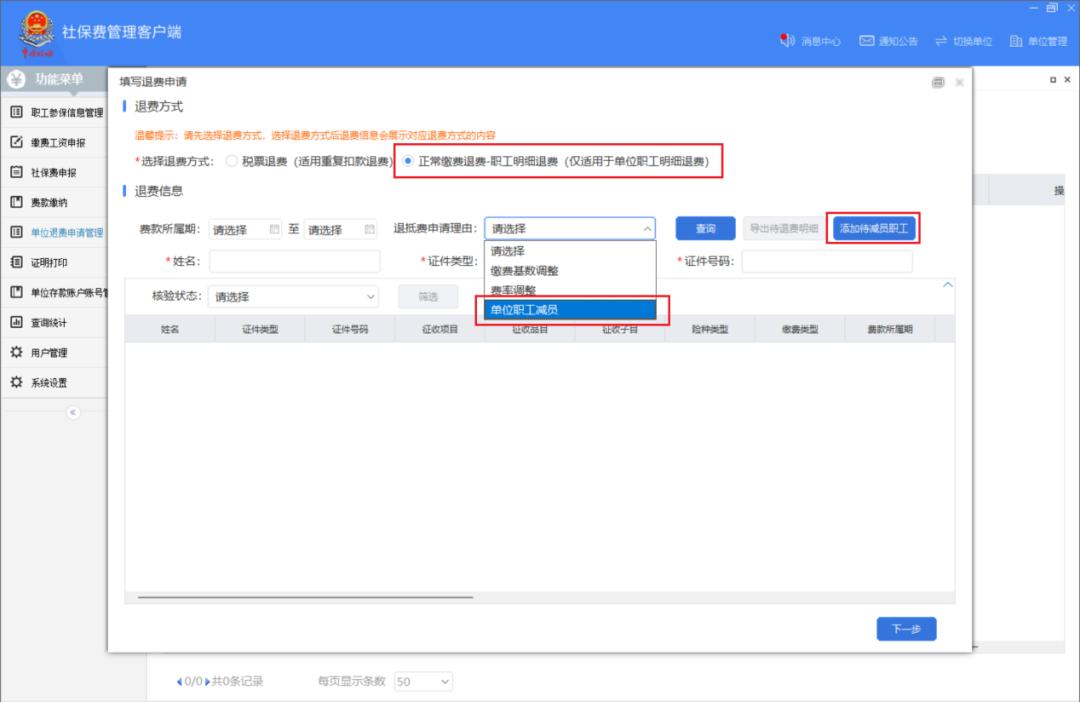 2若缴费人为职工调低缴费基数退费等业务场景,选择【正常缴费退费】→【职工明细退费】。