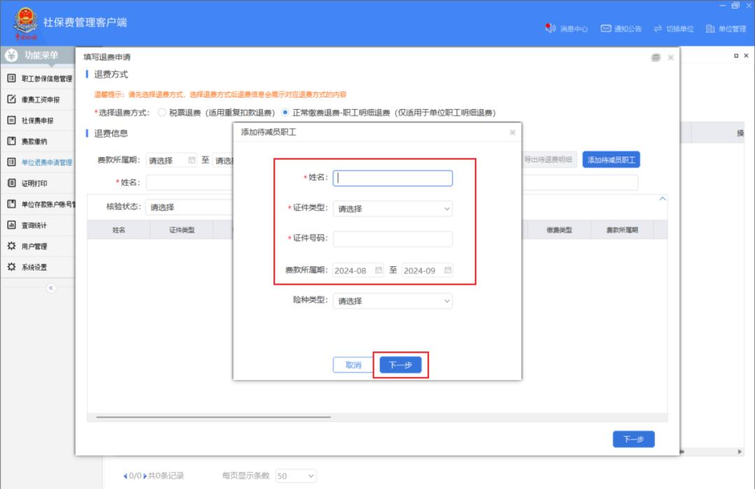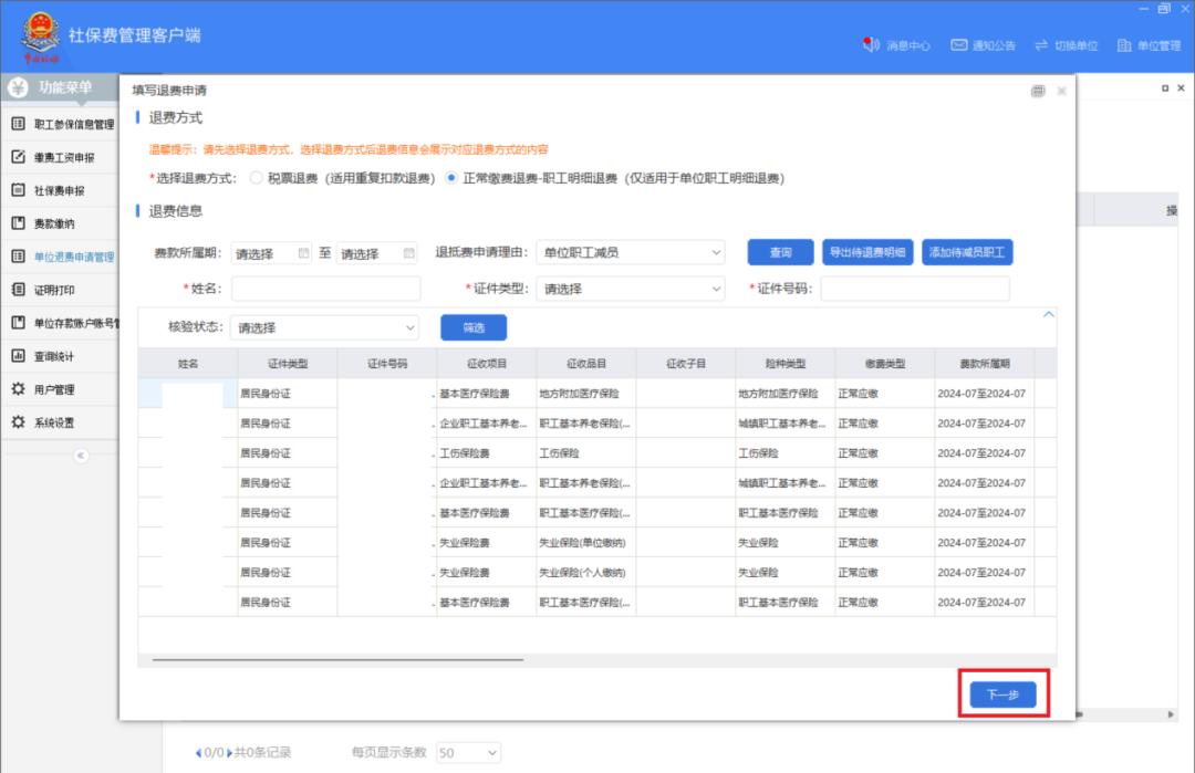 3录入晚退保人员信息,选择准确的待退费所属期后点击【下一步】。