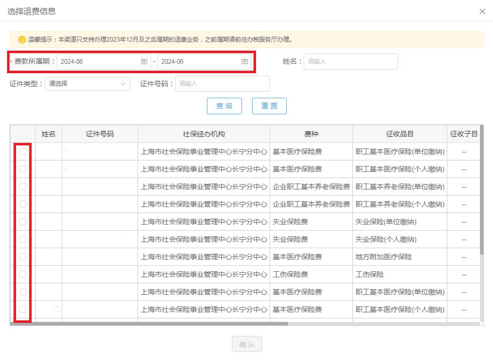 4填写费款所属期及退费职工姓名、证件类型、证件号码等信息,点击【查询】,系统带出对应的待退费信息,对待退费信息进行勾选。