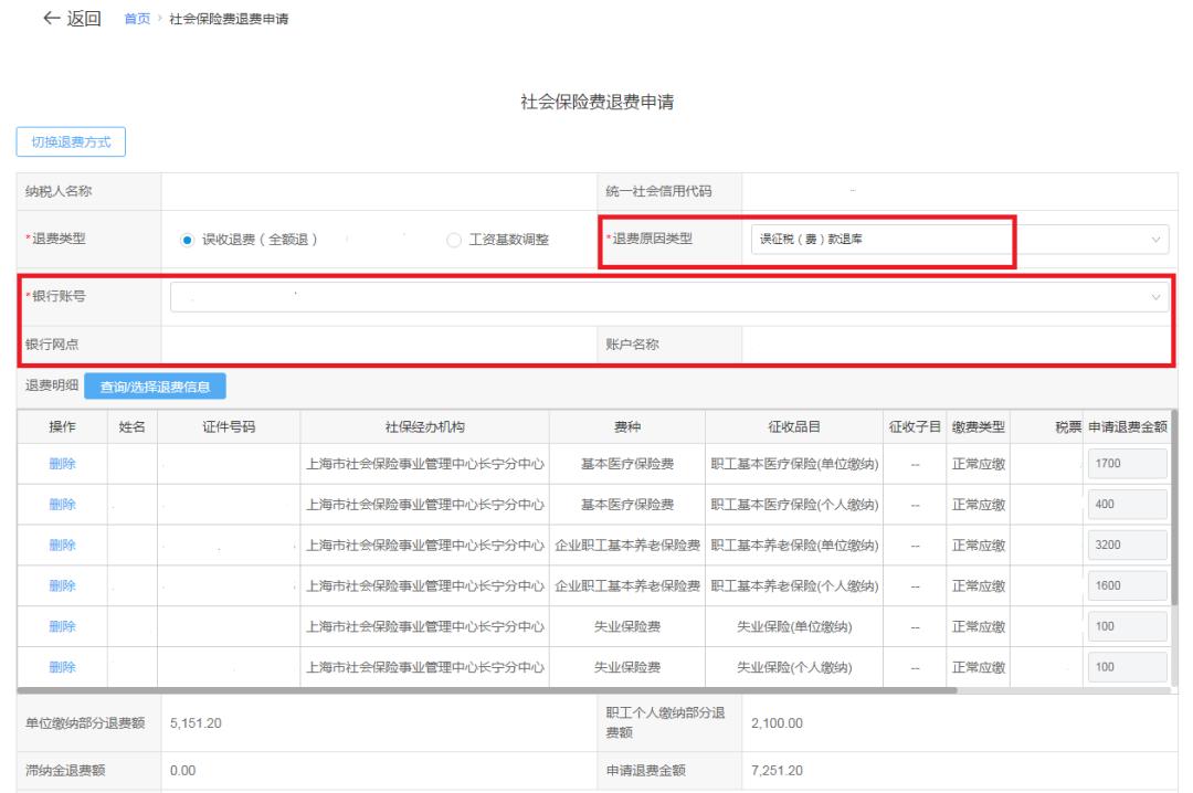 5返回退费申请界面,选择银行账号、退费原因类型等信息。