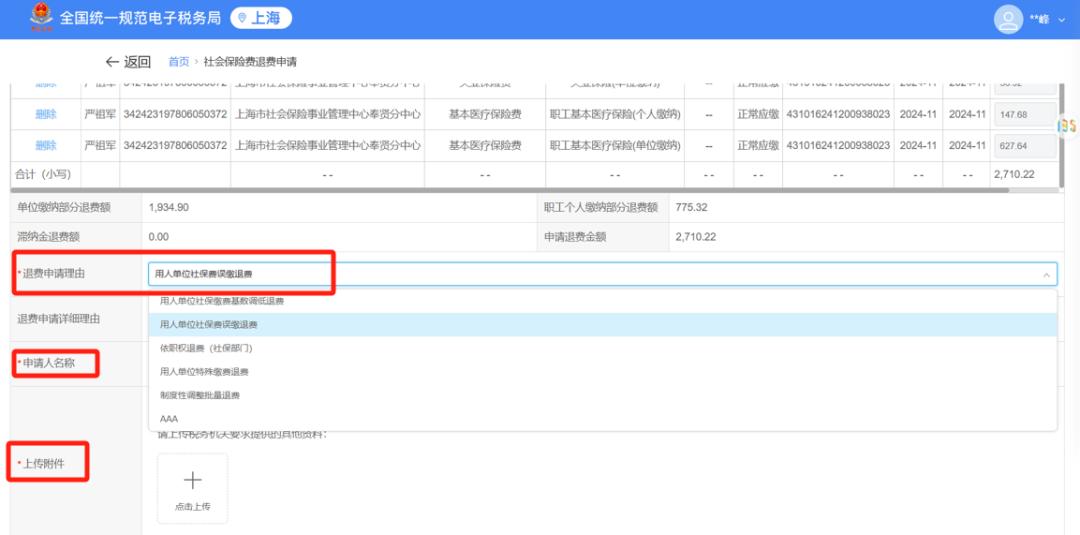 6选择退费申请理由为“用人单位社保费误缴退费”,填写申请人名称等必录项,按要求上传附件材料。确认退费金额及信息无误后,点击【提交】。