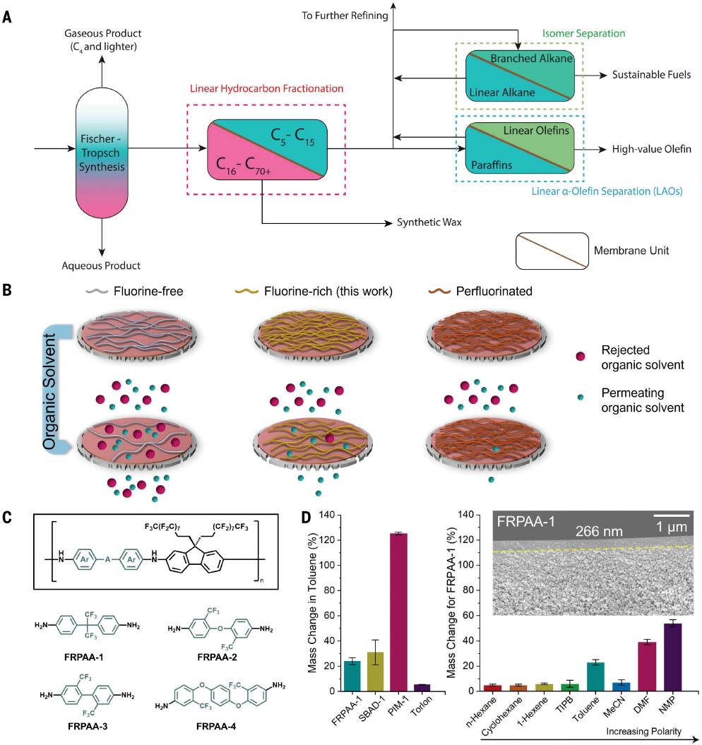 图1. a) FT产物分离规划; b-d) 富氟型聚芳基胺高分子膜材料的设计、合成与表征尺寸差异小的液态烃类混合物的分离是膜分离领域中极具挑战性的研究方向。如何设计膜材料使其兼具高分离性能与耐溶剂性能是该领域的核心要点。针对该核心问题,郭盛团队设计与合成了一类富氟型的聚芳基胺材料(FRPAAs),通过精准控制氟含量到恰到好处的数值,使得富氟型高分子材料具备富氟材料的耐溶剂性能的同时保持了通用高分子材料的溶剂可加工性,解决了分离应用对于膜材料加工与耐溶剂性的核心要求;另一方面,与低渗透性的全氟膜材料(特氟龙)不同,FRPAA类高分子材料中具有刚性的芳基胺骨架结构,通过该结构的调节能够精准控制膜材料的分离通量与选择性,来满足分离应用对于膜材料高通量与高分离选择性的核心要求(图1b-d)。