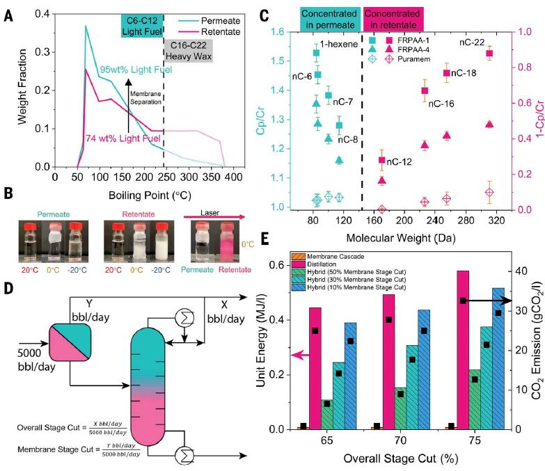 可持续烃类作为燃料与化工品的大规模使用将颠覆当前石化产品主导的资源体系,是人类社会实现可持续发展的关键。新型高效的膜分离技术能够极大地降低可持续烃类分离纯化的能耗与经济成本,加速可持续烃类的大规模应用的推广。利用绿氢、捕获CO2以及可再生能源为驱动的Fischer-Tropsch (FT) 过程是可持续烃类的重要生产方式。然而,从组分复杂的FT产物中分离纯化高价值液态烃的成本较高,极大限制了该类产物的精细化应用。