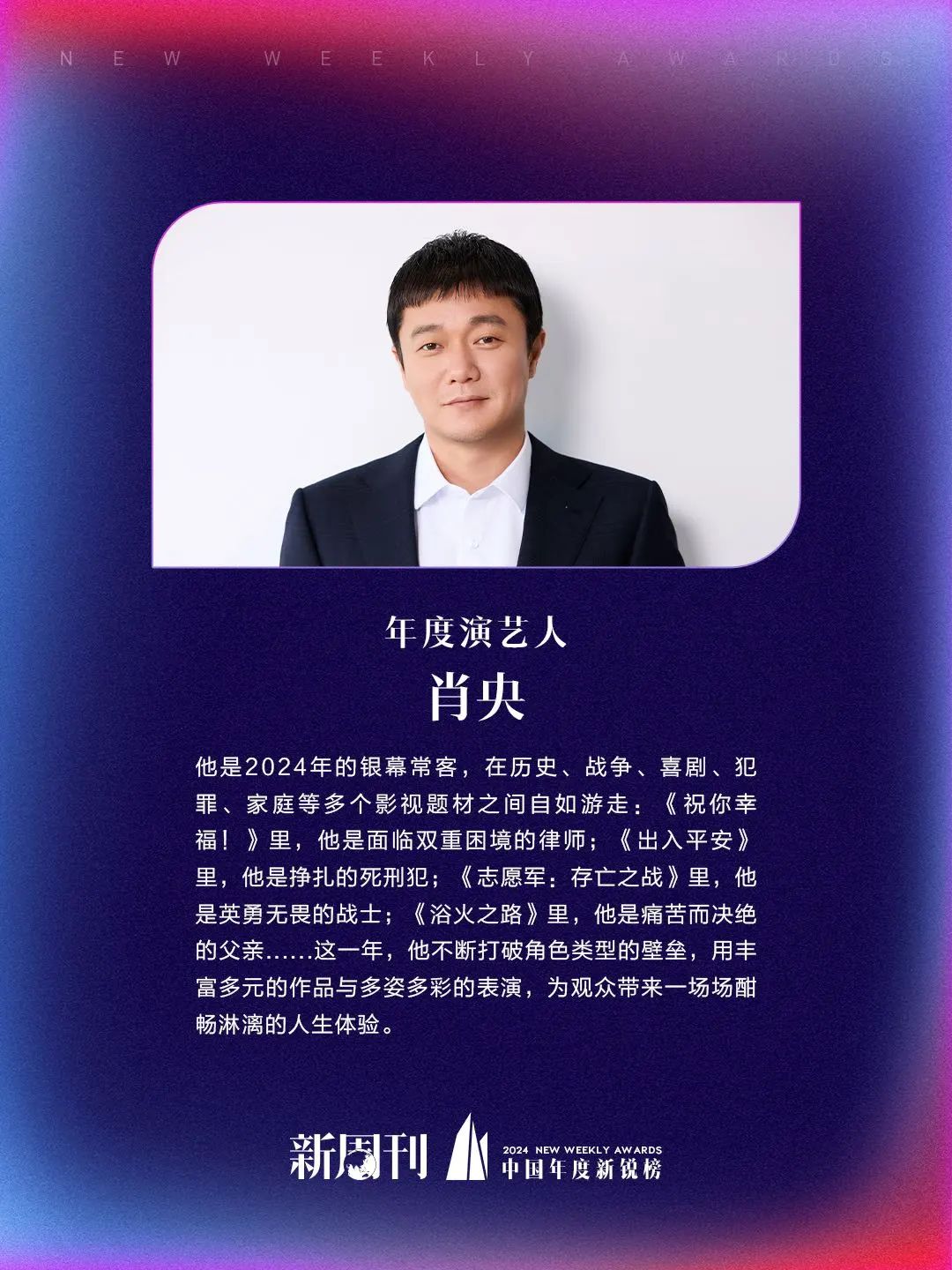 去年上映的七部戏是肖央在两三年里陆续拍完的,他并未刻意提高自己的工作强度。在这个人生阶段,他越发关注家庭和健康,正在有意识地放慢工作节奏,留更多时间给家人和养生。不过,遇到一看就停不下来的剧本时,他还是会果断接演,因为好剧本可遇不可求。