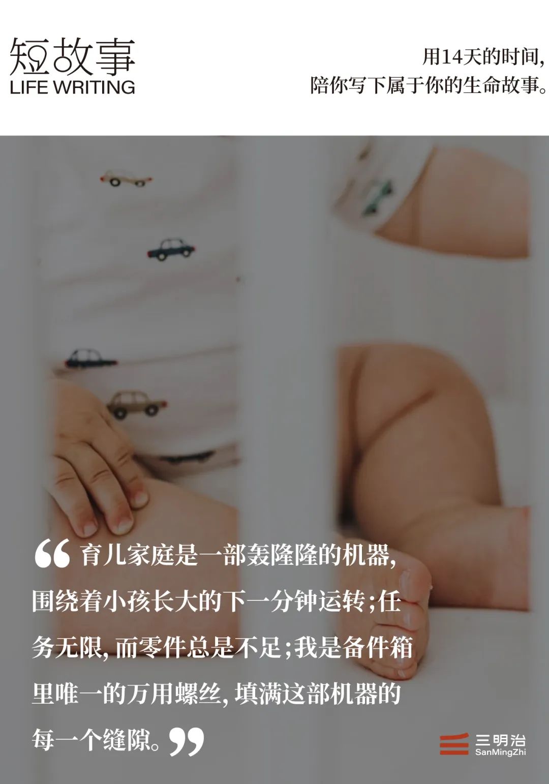 育儿家庭是一部轰隆隆的机器,围绕着小孩长大的下一分钟运转;任务无限,而零件总是不足;我是备件箱里唯一的万用螺丝,填满这部机器的每一个缝隙。