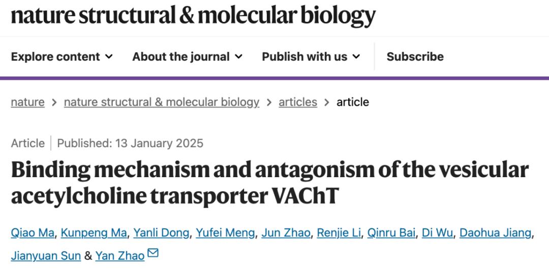 2025年1月13日,中国科学院生物物理研究所赵岩团队在 Nature 子刊 Nature Structural & Molecular Biology 发表了题为:Binding mechanism and antagonism of the vesicular acetylcholine transporter VAChT 的最新研究成果。