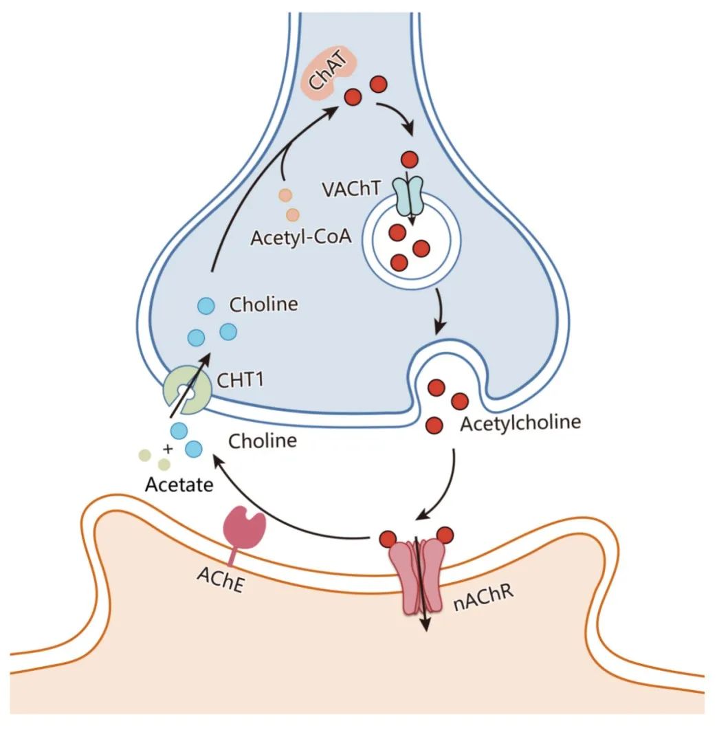 以肌无力综合症为例,胆碱能神经元或其下游肌肉的运作障碍将逐渐侵蚀患者的日常生活能力:从表情僵硬、吞咽困难,到四肢动作受限,最终步态变得迟缓甚至完全丧失行走能力。在病程后期,由于呼吸肌无力或心脏等关键器官功能的衰竭,生命因此受到威胁。而在中枢神经系统中,胆碱能神经元则承担着认知和记忆的重要功能。当这些神经元发生异常或逐渐丢失,患者逐渐经历智力衰退、语言障碍和感知力减弱。阿尔茨海默症、帕金森综合征的发生也与胆碱能神经元的减少密切相关。这些不仅凸显了胆碱能神经信号传递在生理、病理中扮演者关键角色,也是相关疾病的诊疗关键。