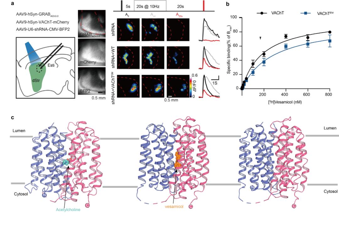 为了深入理解这些相互作用对转运功能的影响,研究团队将与乙酰胆碱及质子结合密切相关的关键氨基酸进行了突变,并在小鼠大脑背侧纹状体内对胆碱能神经元释放乙酰胆碱的功能进行了研究(见图2a)。纹状体内乙酰胆碱的释放对包括运动控制、决策行为、学习和记忆在内的多种生理功能具有重要调节作用。我们发现相关的突变会直接影响乙酰胆碱在纹状体中的释放,直观地阐释了质子结合、底物转运与生理功能之间的关系,为理解VAChT在乙酰胆碱转运、储存和释放中的作用提供了重要见解。