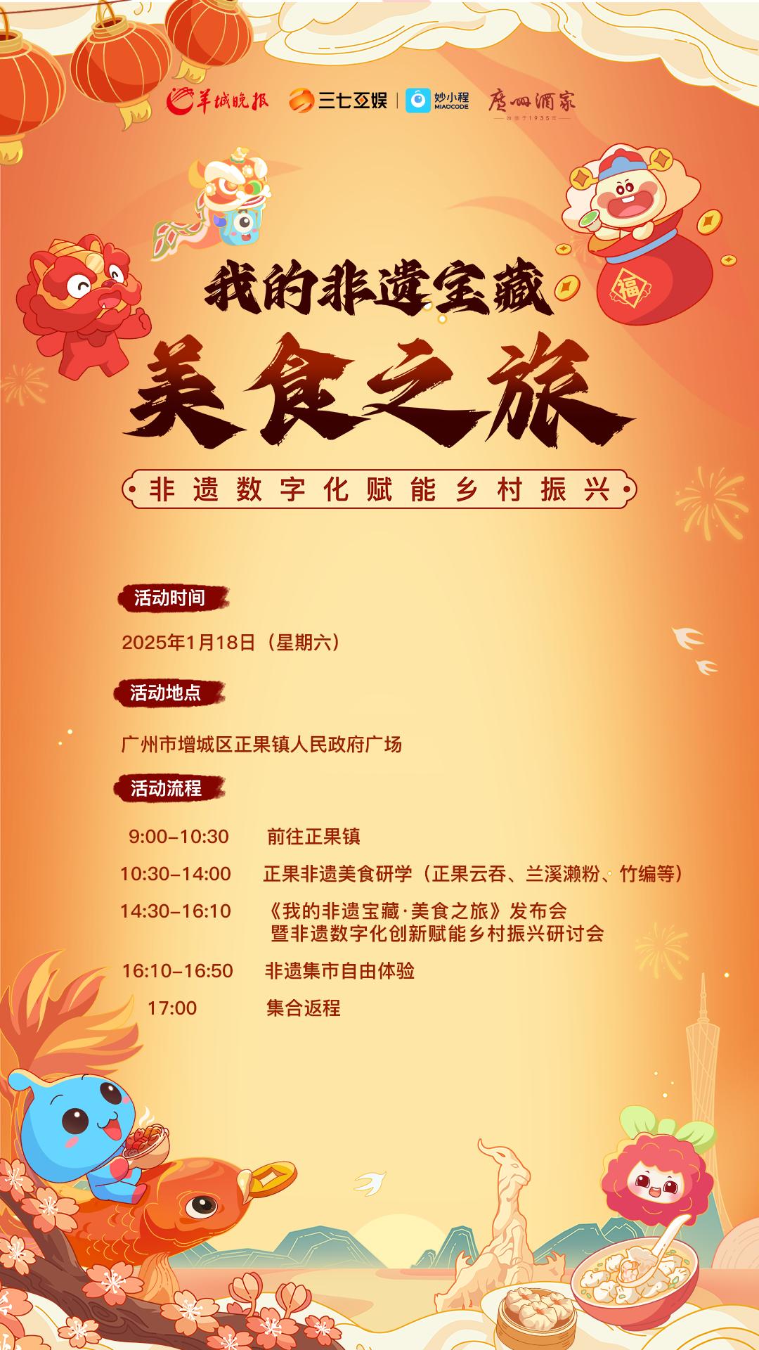 由羊城晚报社、三七互娱、广州酒家集团及增城区正果镇人民政府联合举办的“我的非遗宝藏——美食之旅”青少年研学活动将于1月18日开启。正果镇历史悠久,美食文化底蕴深厚。在这里,孩子们能近距离观赏正果云吞、兰溪濑粉等传统美食的制作过程,了解其背后的历史渊源和文化故事,感受传统技艺的精巧。
