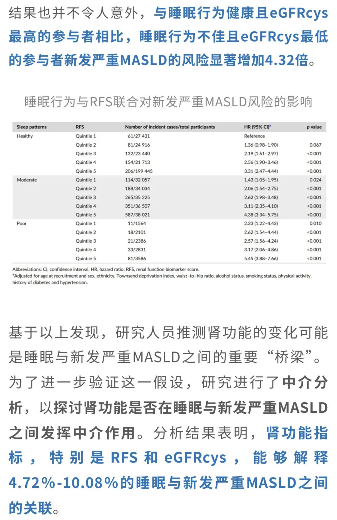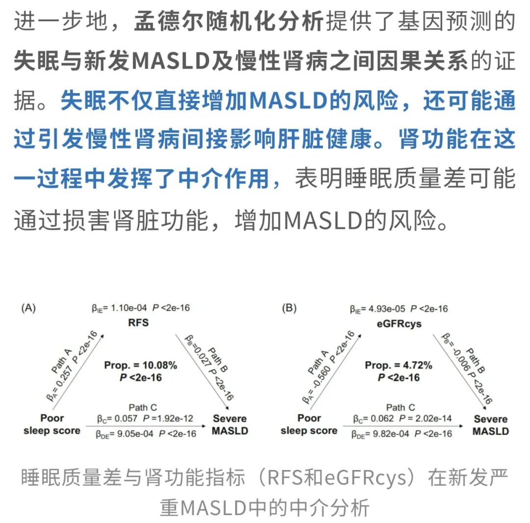 这一发现表明睡眠质量差通过影响肾功能,进而增加新发严重MASLD的风险。