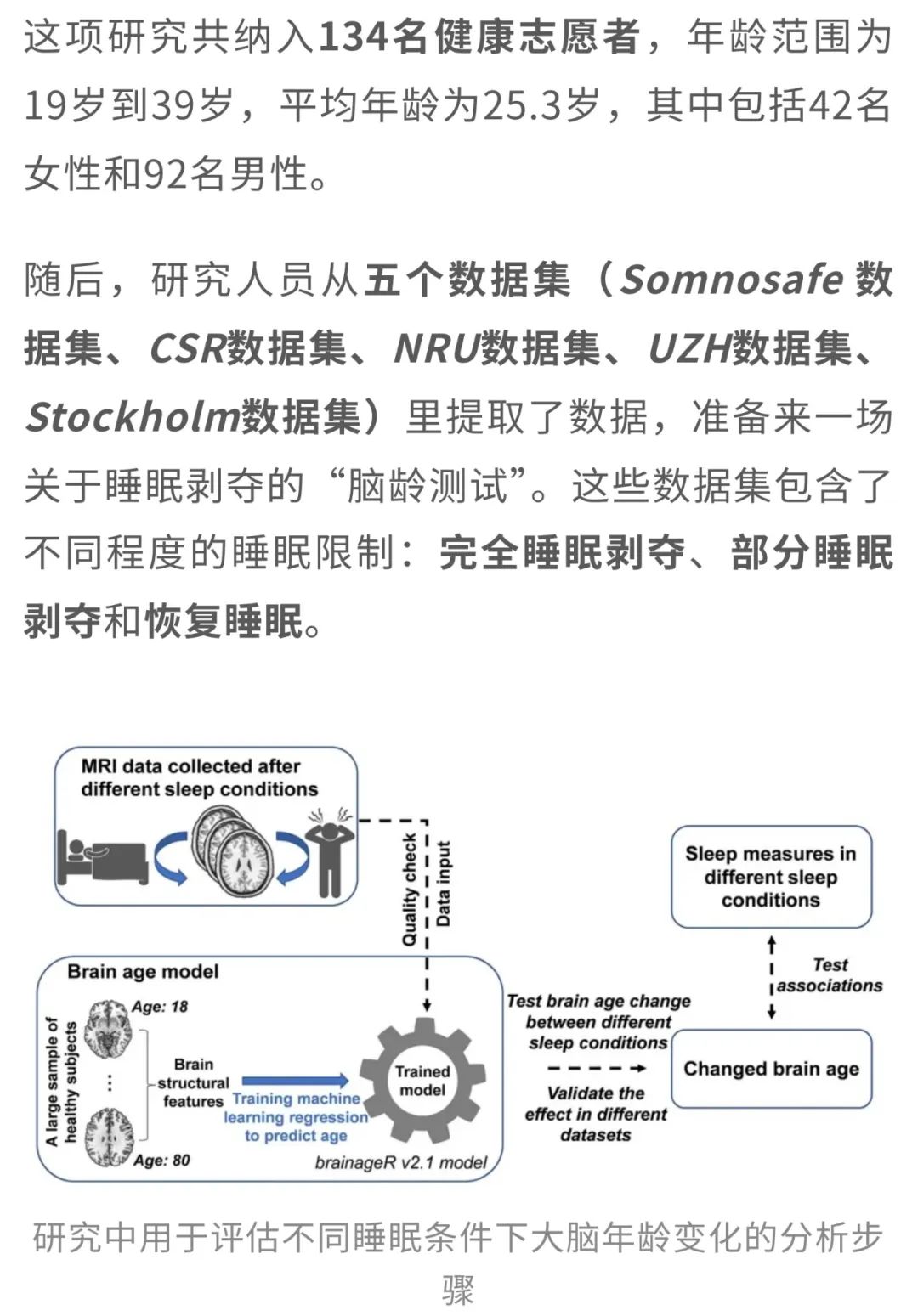 既往已有研究表明,大脑衰老和睡眠中的脑电活动变化息息相关,而且我们或许都曾留意到,随着年龄的增长,很多人都会抱怨“睡得不好”——无论是睡得太短,还是睡眠中断,似乎年纪越大,睡眠质量越差。本研究的研究人员显然也留意到了这一点,并大胆设想:睡眠剥夺会不会加速大脑衰老?这个过程可以通过“脑年龄”指标来衡量吗?为了验证这个假设,研究人员决定用“大脑年龄”这一创新方法来看看睡眠剥夺对大脑的究竟影响有多大。什么是“大脑年龄”?简单来说,它就像是大脑的“年龄证”,根据大脑的结构特点,通过机器学习模型预测出它的“生理年龄”。