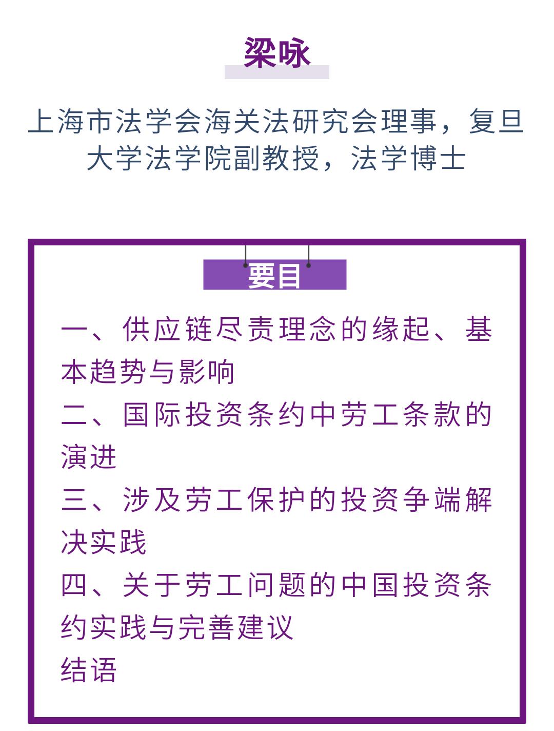 上海市法学会 东方法学向上滑动看下一个原标题:《梁咏|供应链尽责理念影响下的国际投资条约中的劳工条款:国际实践与中国对策》
