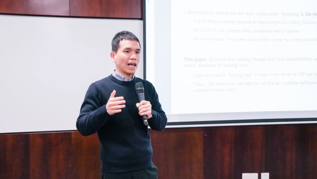 马啸马啸助理教授介绍了论文“Who Pays for Training? Theory and Evidence on Firm-Level Differences in Training Investments”(《谁为培训买单?——基于企业层面培训投资差异的理论与实证研究》)。在终身人力资本理论与企业内部培训机制的研究背景下,不同企业特征的培训投入及成本分担对企业绩效与劳动力收入具有哪些影响?他采用来自全球 100 多个国家的调查数据及墨西哥和中国的行政数据,结合定量模型分析方法,研究了企业规模、生产率(TFP)、劳动份额与培训投入之间的关系。研究结果表明,规模较小、生产率较低以及劳动份额较高的企业在培训方面的投入显著更少,而且企业在承担培训成本时往往无法完全内化对员工和潜在外部雇主带来的收益,导致培训投资不足。