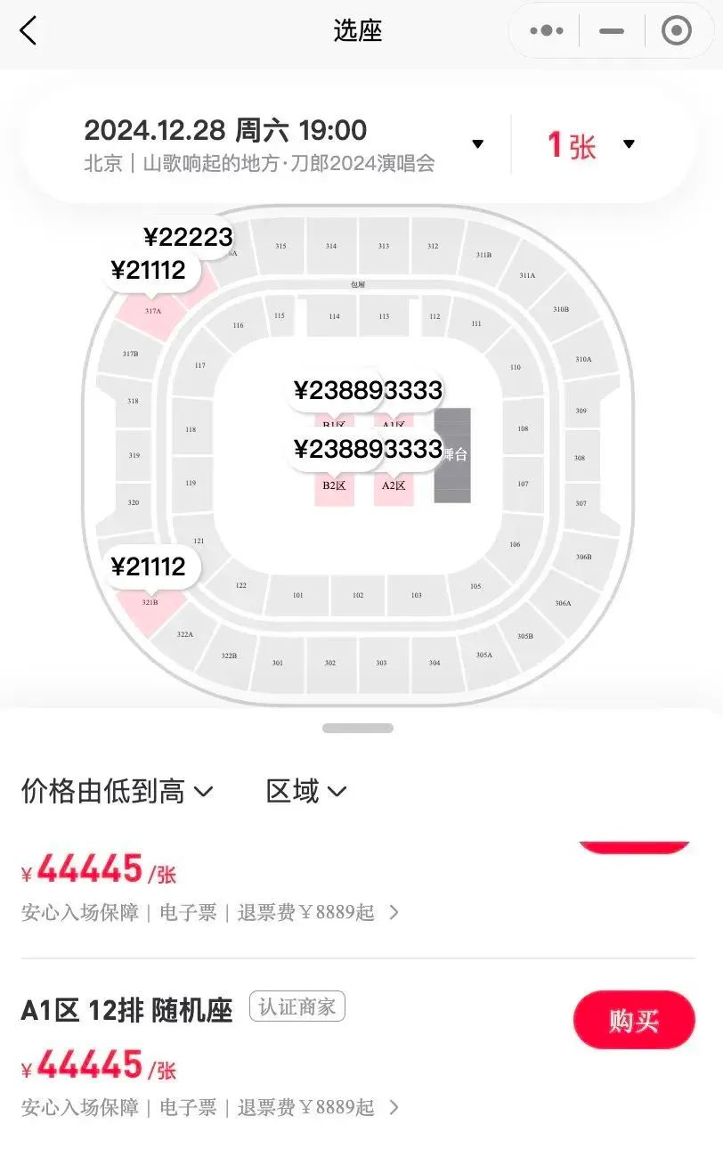 2024年12月底,刀郎在北京五棵松体育馆连开两场演唱会,演出之前,二级票务市场上的最高票价,已被炒到高达近5万元一张,一票难求。