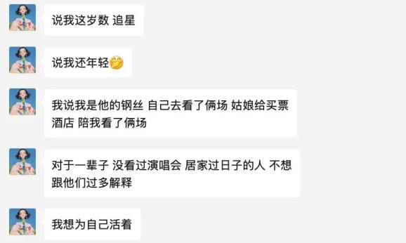 马女士并不在意,反而想得通透:“对于一辈子没看过演唱会,居家过日子的人,不想跟他们过多解释,我想为自己而活。”