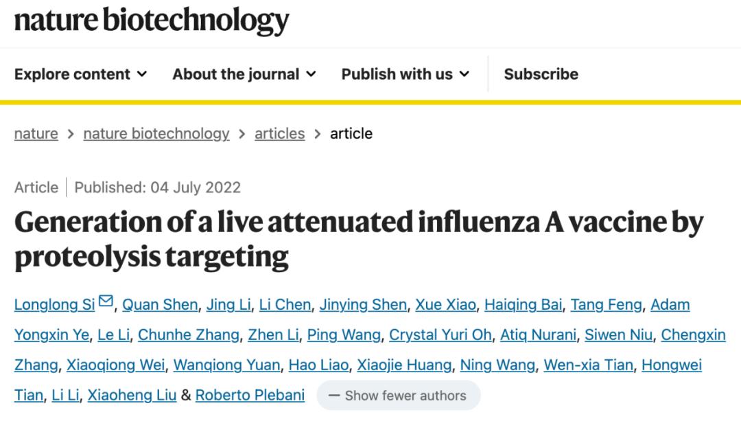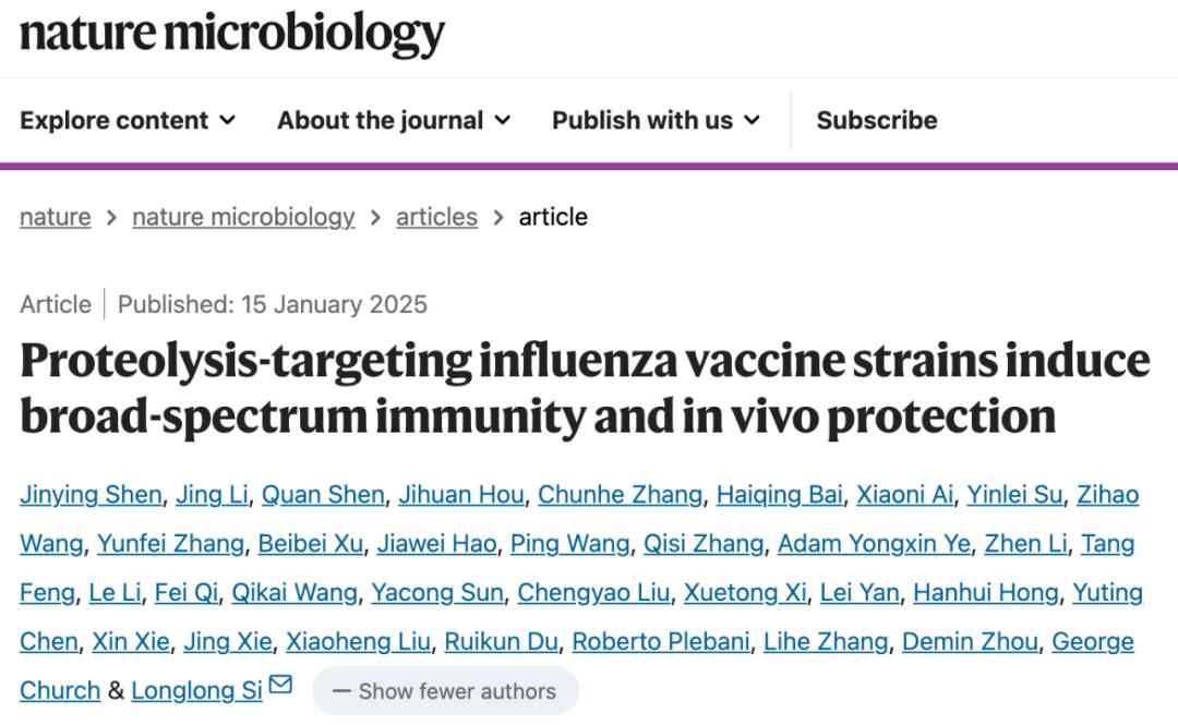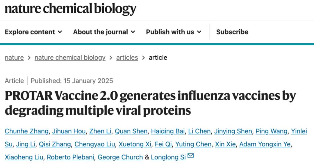 2025 年 1 月 15 日,中国科学院深圳先进技术研究院合成生物学研究所司龙龙团队在 Nature 子刊 Nature Microbiology 和 Nature Chemical Biology 上同期发表两项重要研究成果。论文题目分别是:Proteolysis-targeting influenza vaccine strains induce broad-spectrum immunity and in vivo protection 和 PROTAR Vaccine 2.0 generates influenza vaccines by degrading multiple viral proteins.