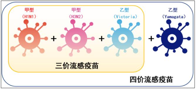 三价流感疫苗可以预防甲型H1N1、H3N2和乙型Victoria病毒引起的流行性感冒,而四价流感疫苗除了以上三种病毒类型外,还可以多预防一种乙型Yamagata病毒。从数量来看,四价流感疫苗比三价多预防一种流感病毒的亚型。