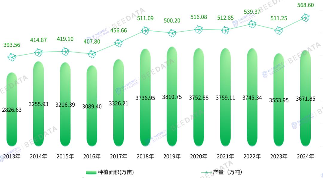 国家统计局数据显示,2013~2024年间,新疆棉花种植面积连续11年保持在3000万亩以上,产量连续7年保持在500万吨以上,均稳居全国首位。随着种植格局的变化,新疆地区凭借其独特优势成为棉花种植的重心,推动了我国棉花产业的持续发展。