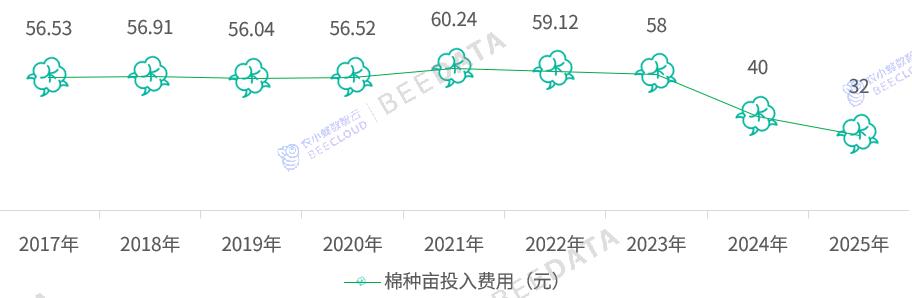 据《全国农产品成本收益资料汇编》和全国种子市场监测信息发布平台数据显示,2017年以来,中国棉种亩投入受种子研发的新技术、生产效率的提高以及进口棉花种子增多等综合因素影响,整体呈波动减少态势。2017~2025年间,中国棉种亩投入从56.53元/亩波动减少到32元/亩,近8年间减少了43.39%。