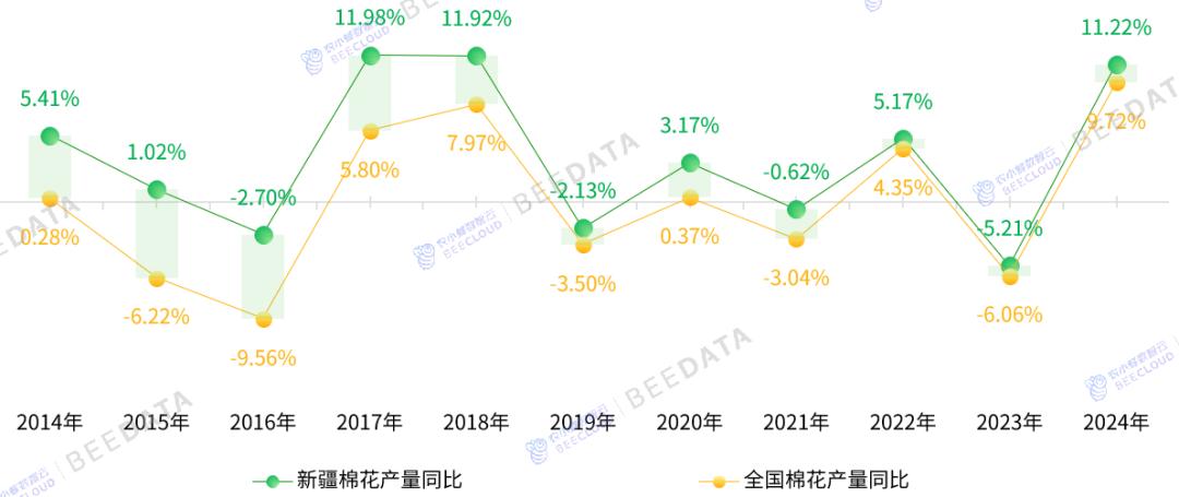 图表6:2013~2024年新疆棉花产量增速变化趋势VS全国