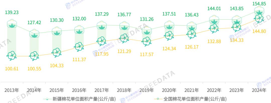 2024年新疆棉花单位面积产量为154.85公斤/亩,同比较2023年增加了11公斤/亩,增幅约7.65%;较同年的全国平均水平(144.8公斤/亩)高出10.05公斤/亩。从长期数据来看,2013~2024年,新疆棉花单位面积产量从139.23公斤/亩波动增长至154.85公斤/亩,近11年间增长了15.62公斤/亩,增幅约11.22%,年均复合增长率约0.97%。