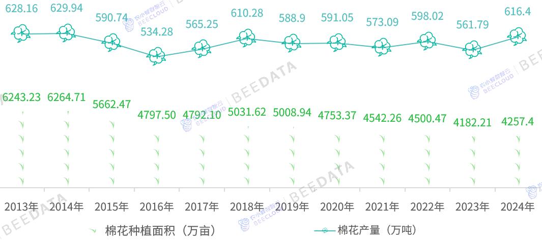 2024年,中国棉花种植面积为4257.4万亩,同比较2023年的4182.21万亩增加了75.19万亩、增幅约为1.8%;与11年前(即2013年的6243.23万亩)相比,近11年来减少了1985.83万亩、降幅约为31.81%。