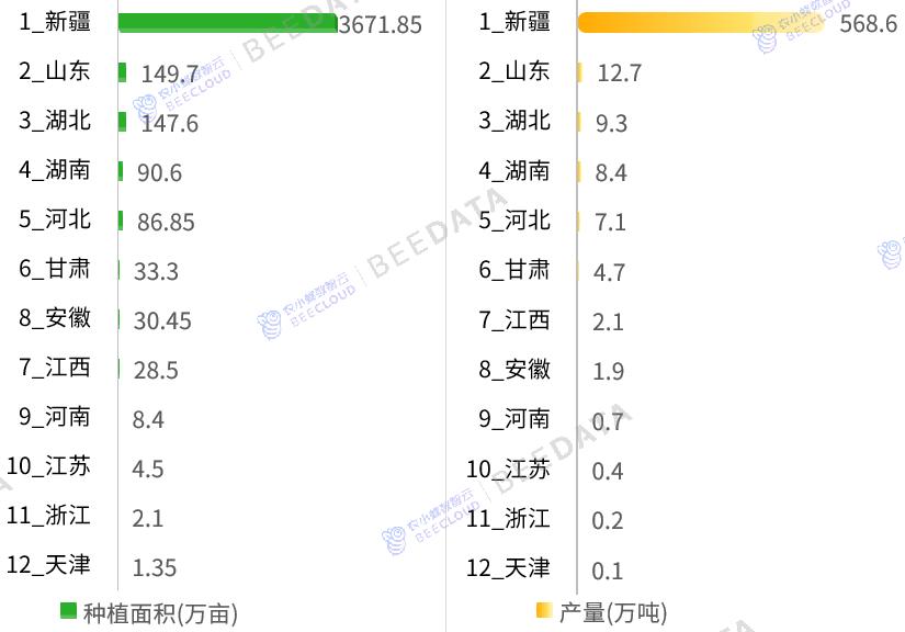 图表3:2024年中国棉花主产地“种植面积、产量”排名对比