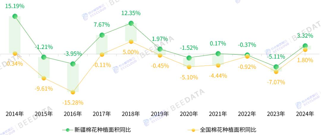 图表5:2013~2024年新疆棉花种植面积增速变化趋势VS全国