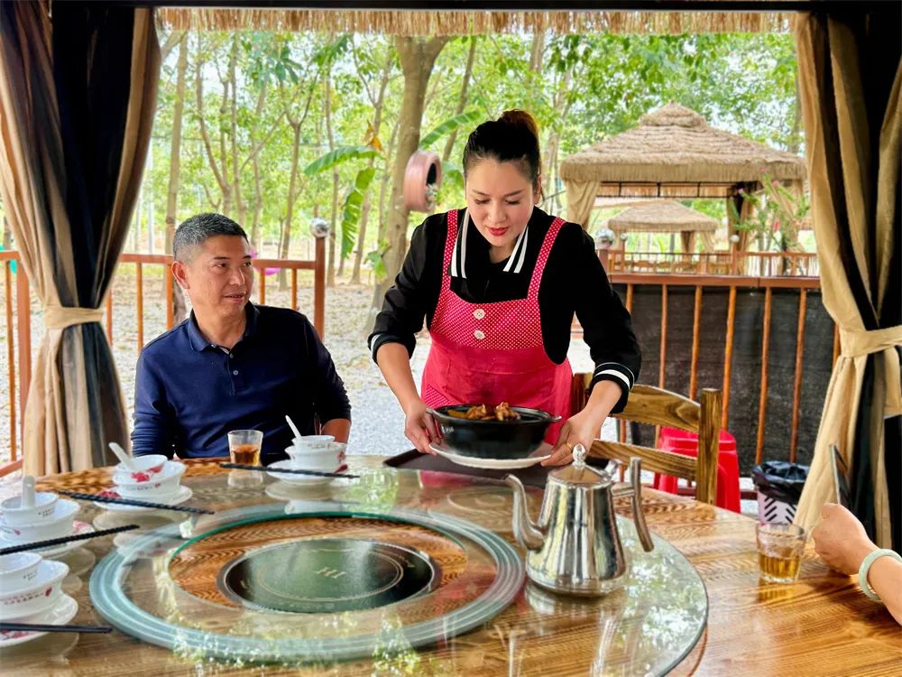 符丽萍为客人上菜(钟玉莹 摄)自2023年3月启动以来,“黎花知音”在县委、县政府的支持下,邀请了来自文艺、教育、心理、医疗等多个领域的省内外专家学者深入基层,用最贴近村民的语言和方式传授知识。至今,项目已累计开展超过120堂课,直接受益村民约3500人次,成效显著。这不仅提升了乡村群众的文明素养,更为乡村振兴注入了强大的精神动力。