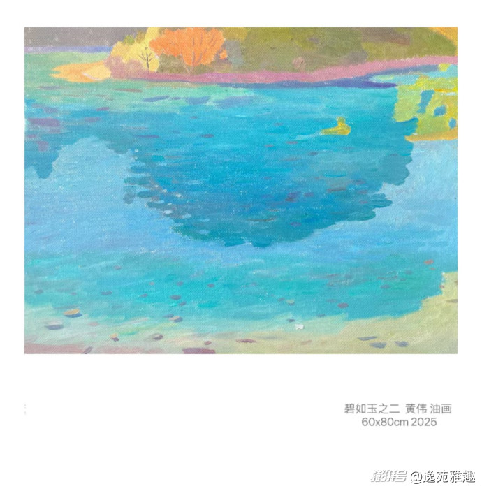 《碧如玉》系列,描绘的是军营村中那碧波荡漾的湖水。画布上,湖面如镜,清澈见底,碧绿的色彩如同翡翠般耀眼,仿佛能洗净人心灵的尘埃。黄伟先生以细腻的笔触,勾勒出了湖水的宁静与深邃,每一笔都蕴含着对大自然宁静之美的深深赞叹。湖畔的垂柳,虽已褪去夏日的繁茂,却以它那柔韧的枝条,轻轻拂过水面,添了几分冬日的柔情。