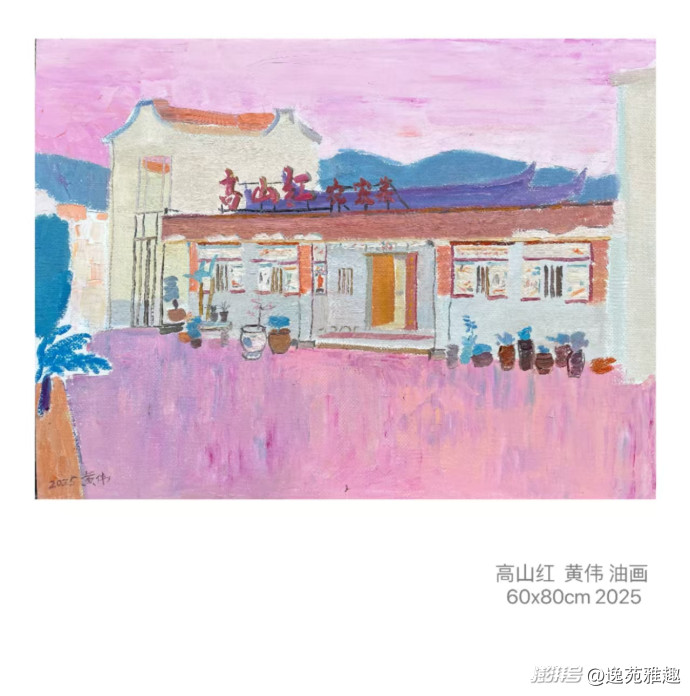 而《高山红》作品,则是以军营村里的餐厅名称为灵感,展现出了一种别样的生活热情与乡村魅力。画布上,餐厅外墙上那鲜红的招牌,在冬日的阳光下显得格外醒目,仿佛在向过往的行人招手。黄伟先生以浓烈的色彩和生动的笔触,捕捉到了这份乡村生活的热闹与欢乐。