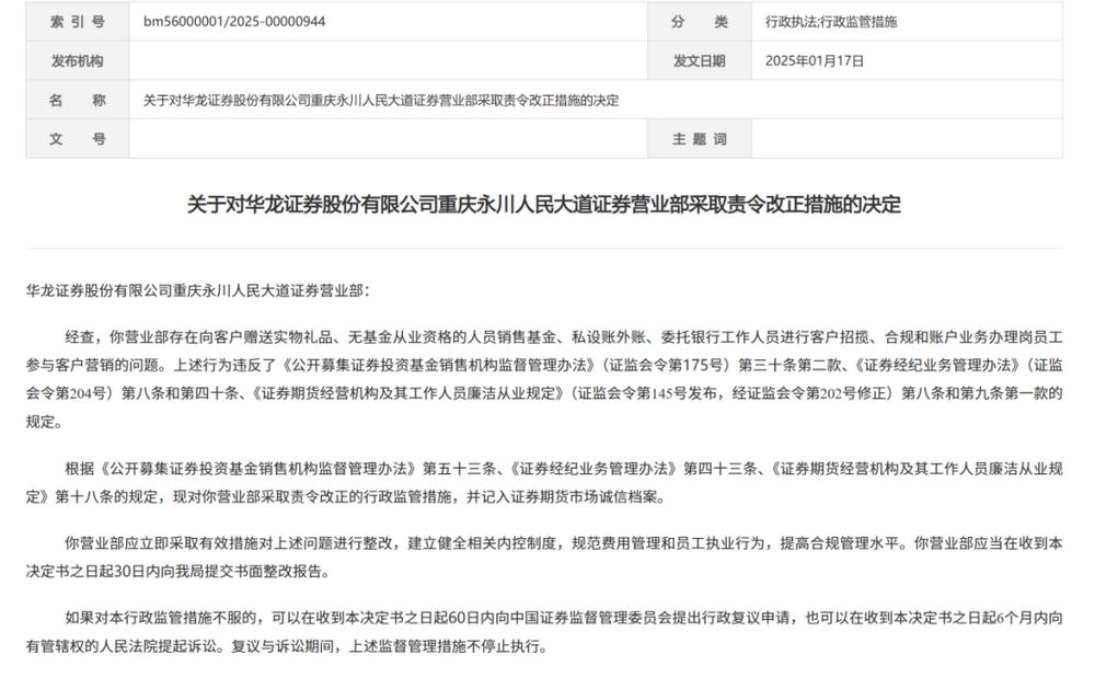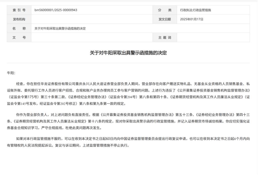 上述行为违反了《公开募集证券投资基金销售机构监督管理办法》(证监会令第175号)第三十条第二款、《证券经纪业务管理办法》(证监会令第204号)第八条和第四十条、《证券期货经营机构及其工作人员廉洁从业规定》(证监会令第145号发布,经证监会令第202号修正)第八条和第九条第一款的规定。重庆证监局判定牛阳作为营业部负责人,对以上违规问题负有直接责任,决定对华龙证券重庆永川人民大道证券营业部及负责人牛阳采取责令改正的行政监管措施,并记入证券期货市场诚信档案。